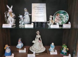 На нижней полке стенда уютно расположились задремавшая Алиса со своей старшей сестрой – статуэтка работы скульптора Ауро Белкари (Италия), а немножко выше можно видеть фигуру самого Кэрролла в виде кружки «Тоби» – создание Дэвида Биггса (Англия). Большой интерес зрителей вызвали пять разнообразных композиций «Безумное чаепитие», в которых за столами сидят одни и те же герои, но они не повторяют друг друга. Наверное, выставку можно было бы назвать «Приключения Алисы в Стране фарфора», если бы не то обстоятельство, что это уже третья экспозиция, представленная в гостеприимных стенах библиотеки, и поэтому она носит название «Фарфоровые истории 3». Раньше здесь с большим успехом прошла выставка «Чтение на все поколения», где чтение книги объединило фарфоровых бабушек и дедушек с внуками. Затем вниманию читателей были предложены симпатичные зверушки с книгами: читающие ёжики, медвежата, лягушата, совы, зайцы, белочки, которые красовались на выставке «С книгой в лапах». Теперь фарфоровые персонажи сказки «Алиса в Стране чудес» будут привлекать внимание детей и взрослых к этой самой известной и любимой многими читателями книге.