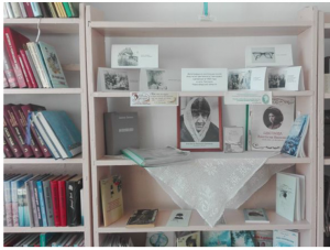 В книге – три повести. Повесть «Моя Сибирь» – вторая. Повесть – хорошая, но производит печальное впечатление. Повесть написана на документальной основе. Видно, что Анастасия Цветаева старалась писать объективно. В 1949 году Анастасию Цветаеву сослали в ссылку именно в нашу Новосибирскую область в деревню Пихтовку, которая находится в 120-ти километрах от Новосибирска (в северном направлении). Сейчас в селе Пихтовка проживает около 500 человек. Оказалось, что Анастасию Цветаеву чтут в местной библиотеке, которая делит одно помещение с почтой. Вот фотография из Пихтовской библиотеки, на которой видно небольшую выставку, посвящённую Анастасии Ивановне: