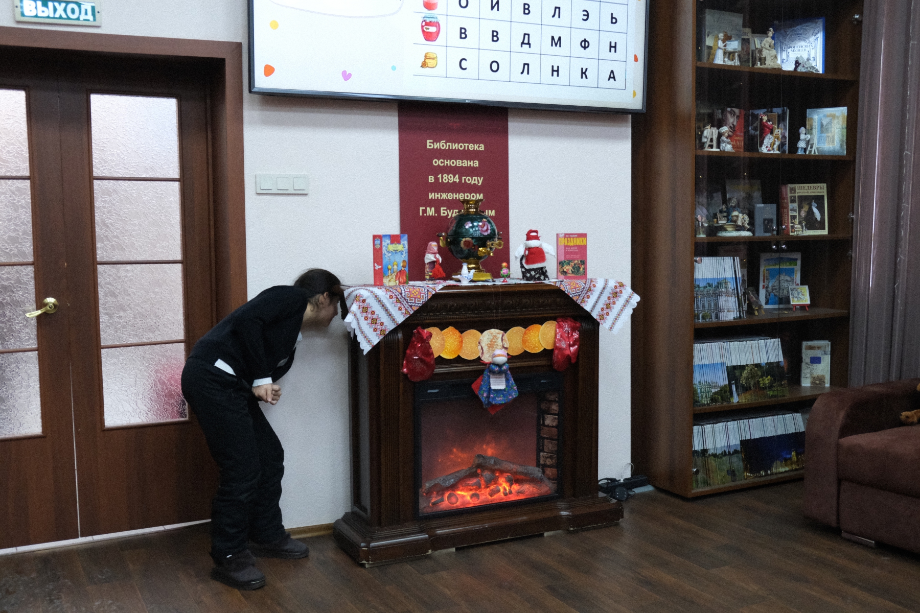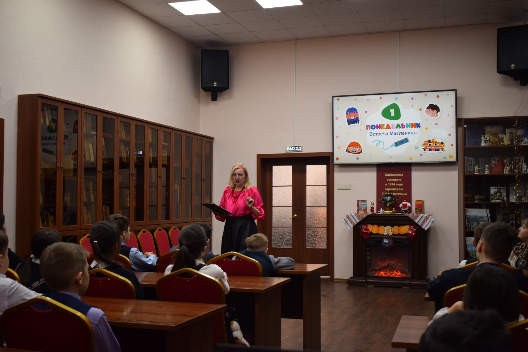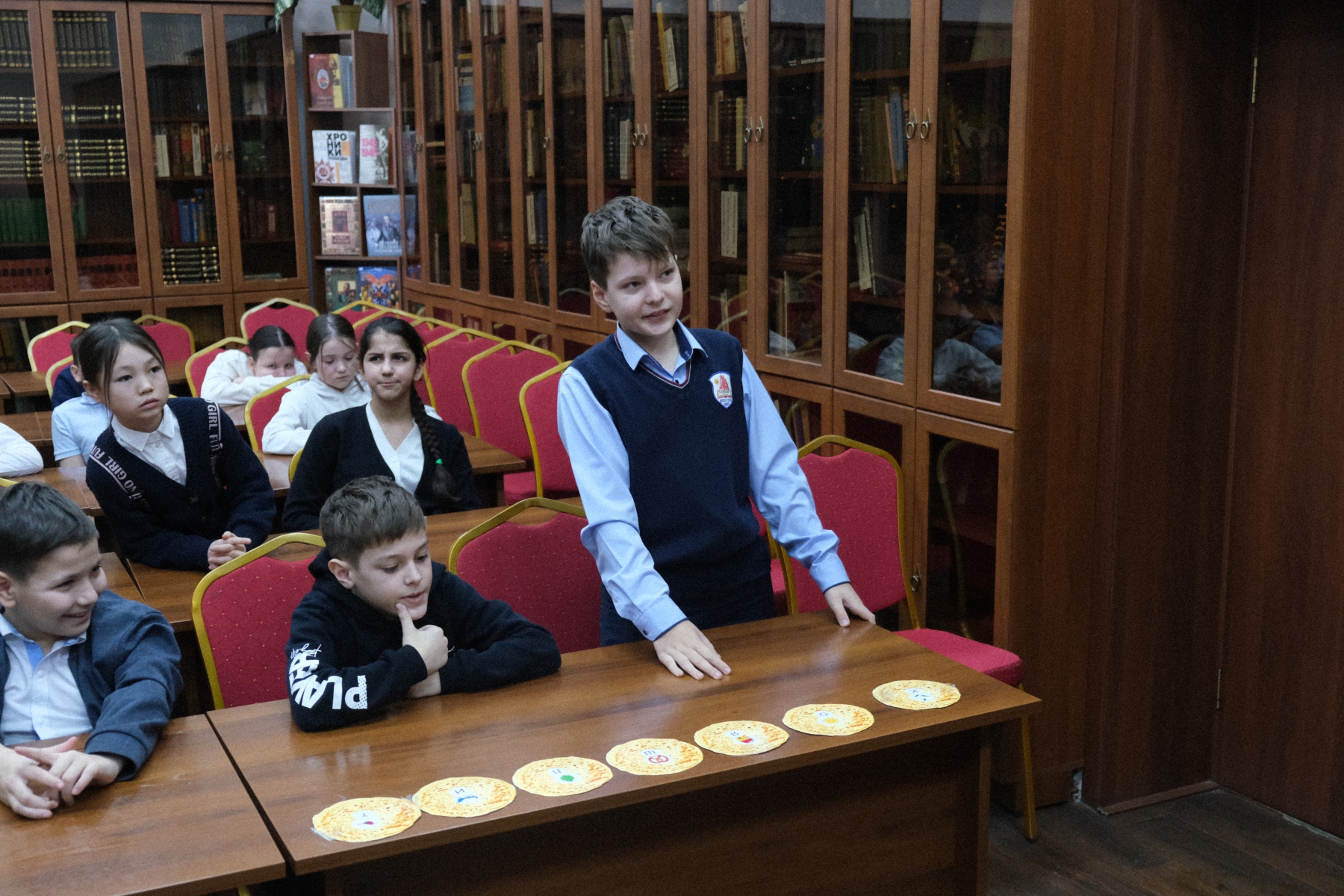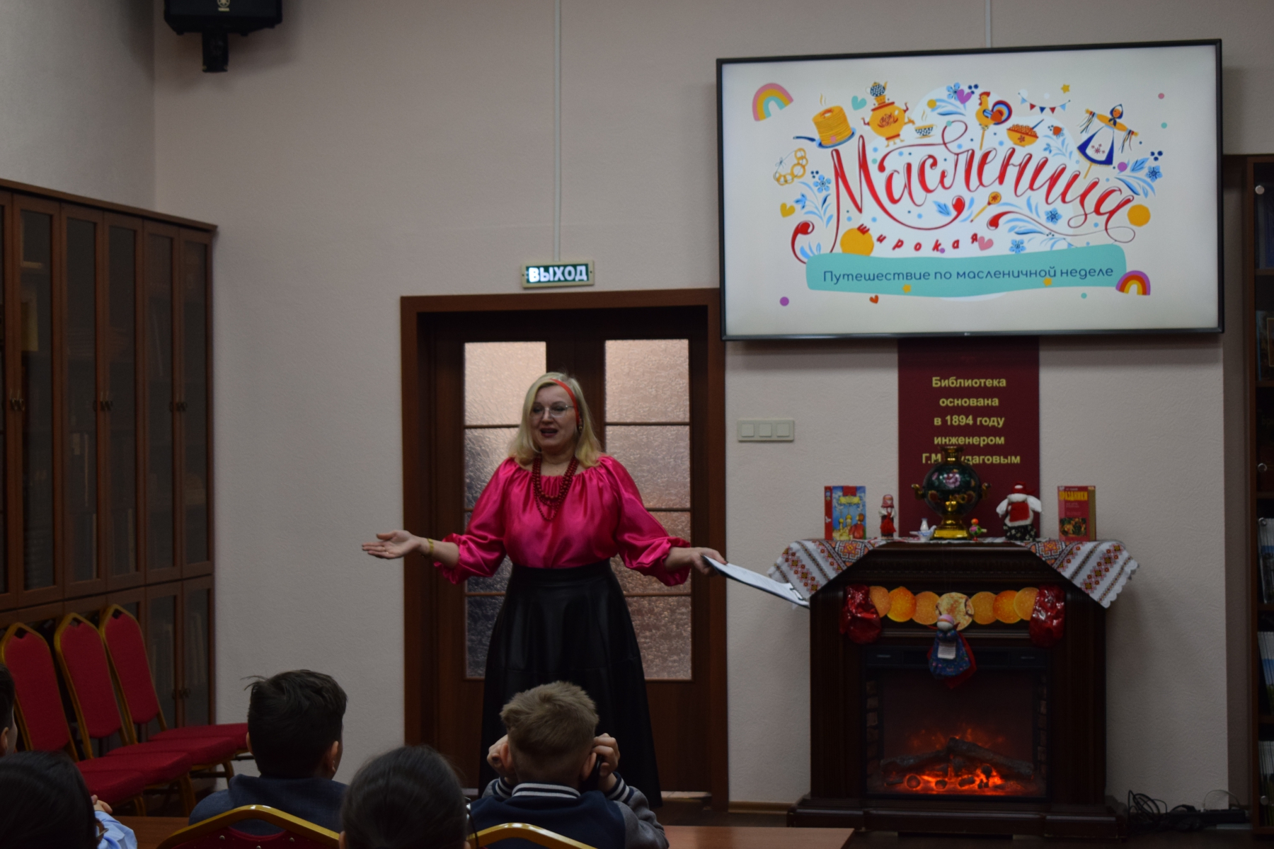 На мероприятии в библиотеке им Л. Н. Толстого дети из СОШ № 52 не просто играли, они отправились в путешествие по масленичной неделе, следуя за подсказками Весны. Каждый этап – это новая станция и новый блинчик-символ.
