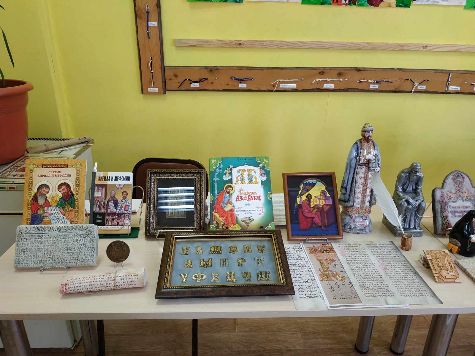 Выставка была выстроена так, что история предстала не набором дат, а чередой живых образов. В центре внимания оказалась витрина со значками – старославянскими буквами, выполненными в технике стилизованной вязи: каждая буква превращалась в узор из трав, ветвей, птиц или зверей. Дети внимательно разглядывали их, угадывая знакомые начертания.