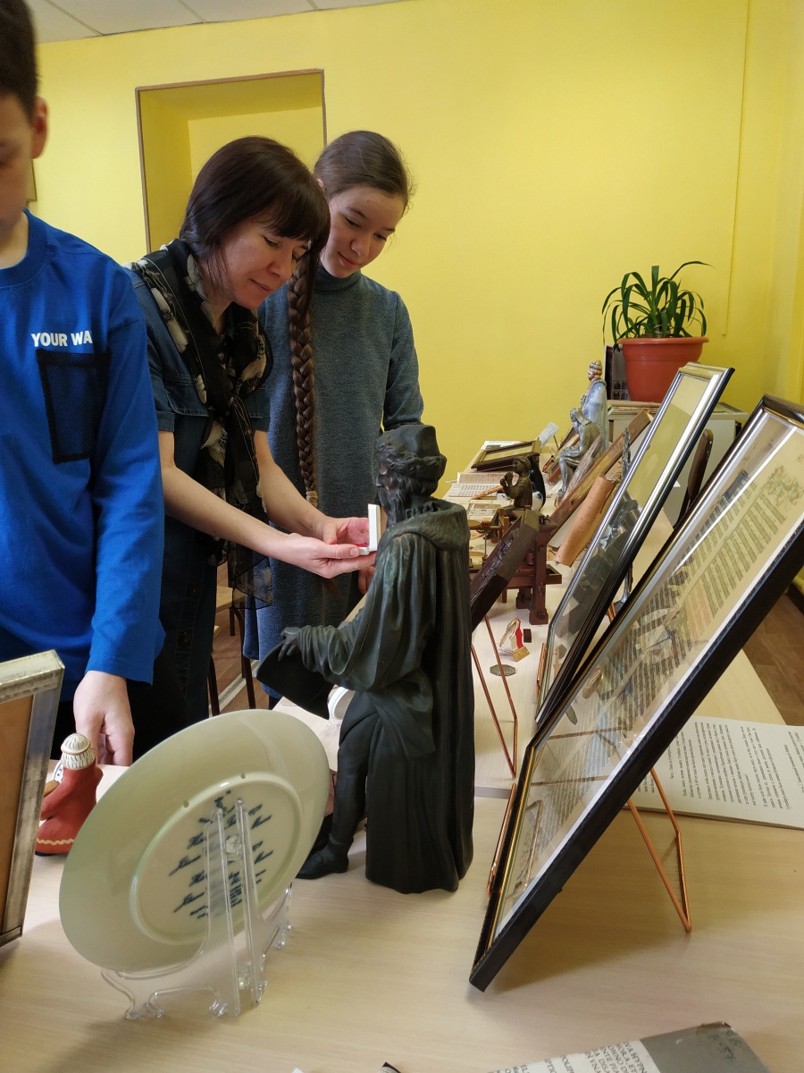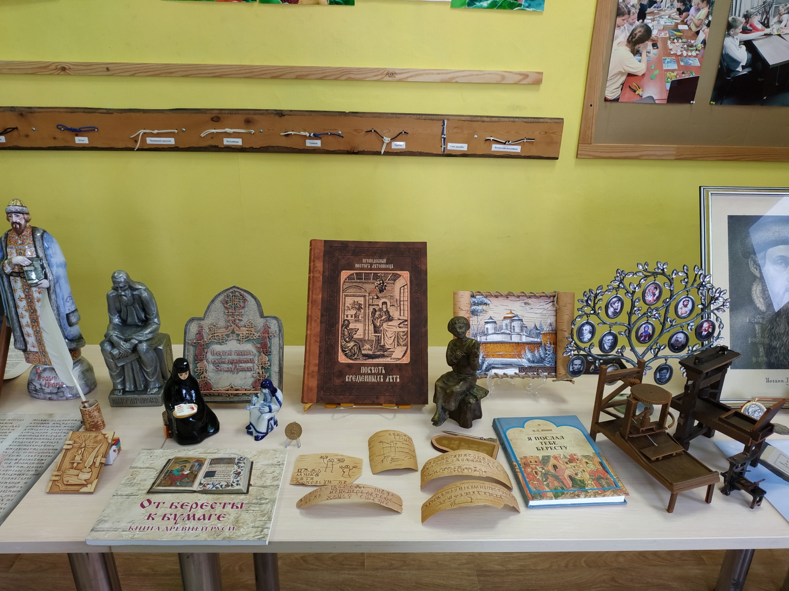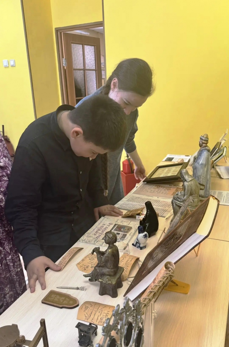 Отдельный восторг вызвала история о мальчике Онфиме. Здесь лектору помогали не только книги, но и статуэтка скульптора С. М. Гаева, и копии берестяных грамот. Ребята узнали, что Онфим – это не вымышленный герой, а реальный новгородский мальчик XIII века. Он учился грамоте так же, как современные первоклассники, и на полях своих берестяных «тетрадей» рисовал всадников, зверей и битвы, старательно подписывая: «Онфиме». Когда археологи нашли и изучили эти грамоты, нам как будто стал слышен голос ребёнка, жившего 800 лет назад. Дети подолгу рассматривали точные копии грамот, выполненные мастером по бересте Любовью Демидовой.