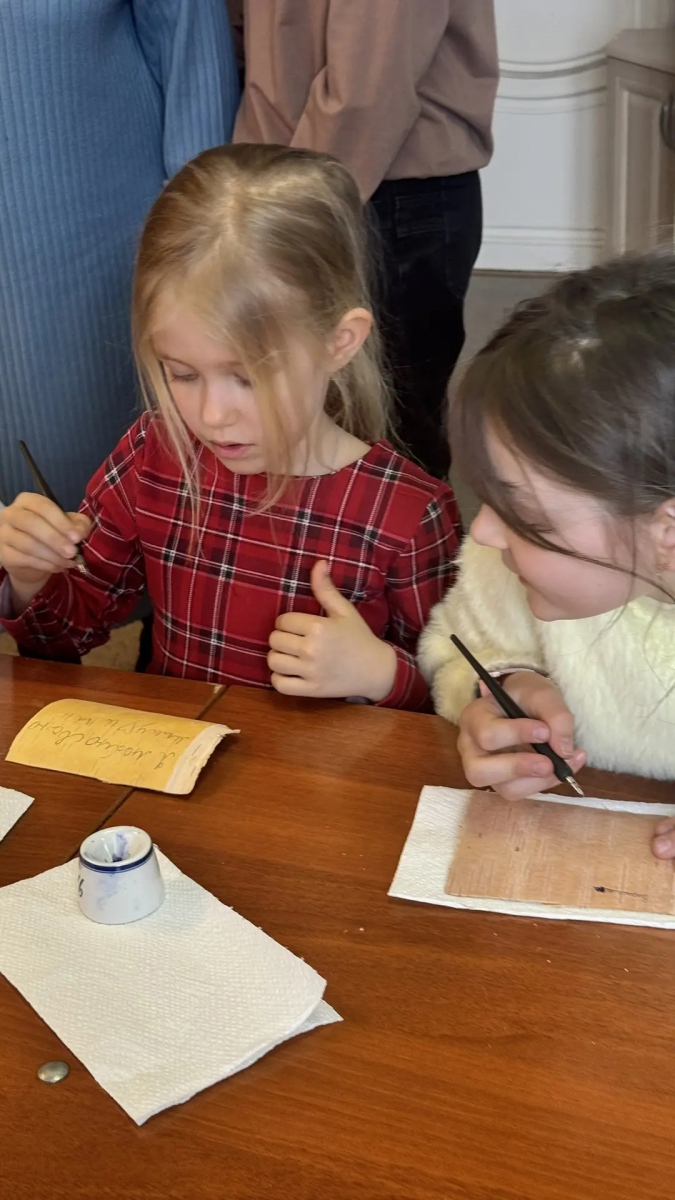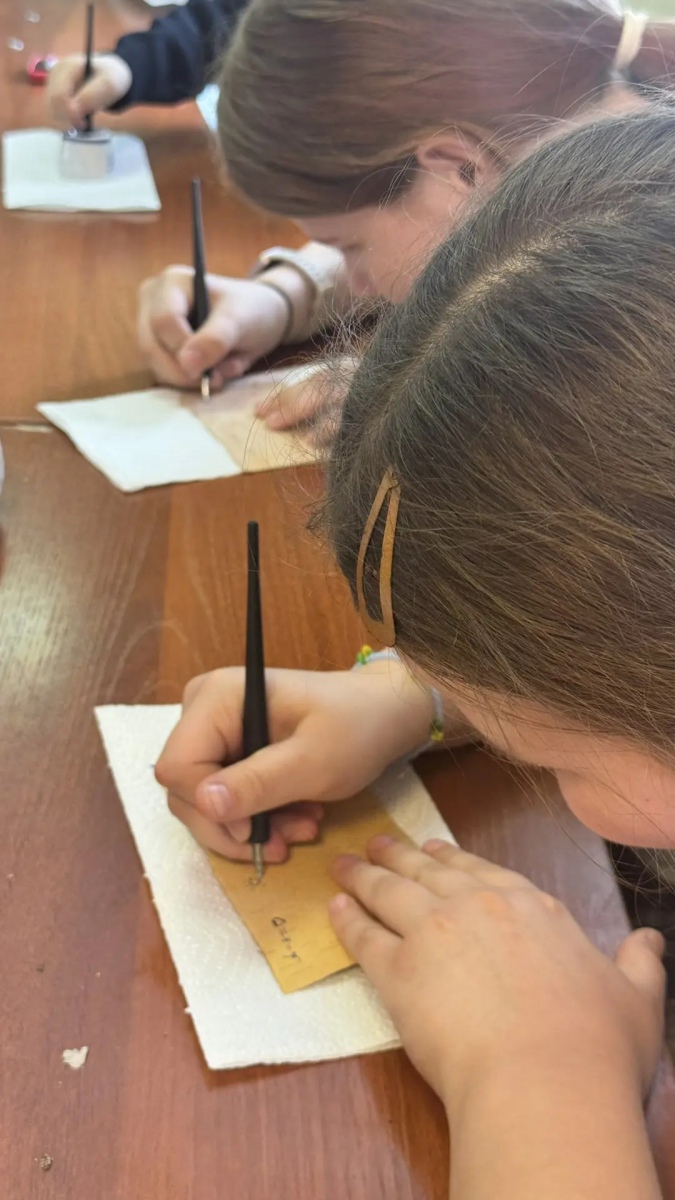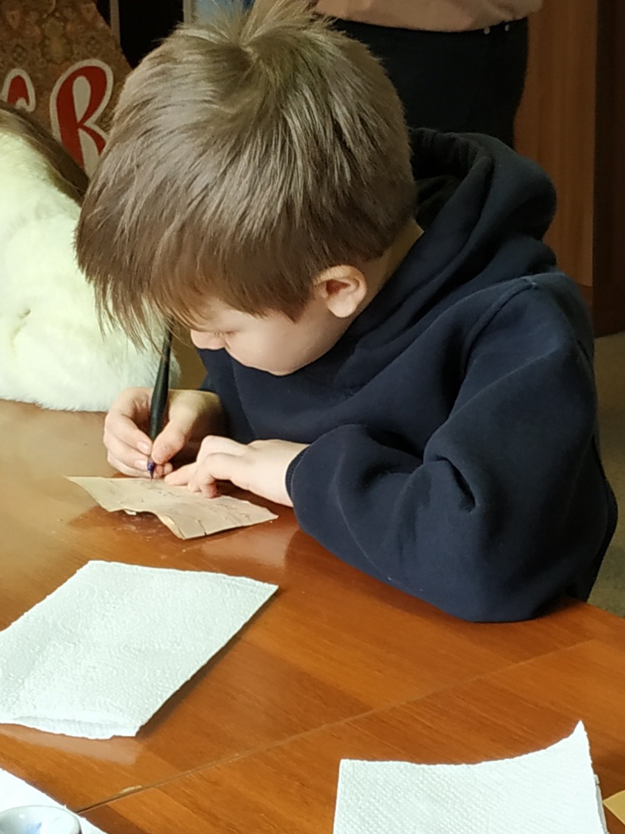 После лекции ребятам предложили попробовать себя в роли древних новгородцев – писать на бересте. Заострёнными палочками и ручками они выводили буквы на кусочках коры. Работа оказалась неожиданно сложной: рука то и норовила соскользнуть, буквы получались неровными. Но именно это вызвало настоящий восторг. Дети убедились: грамота в древности требовала не только ума, но и терпения, сноровки, труда. Кто-то, как Онфим, добавил к буквам рисунок, кто-то написал своё имя.